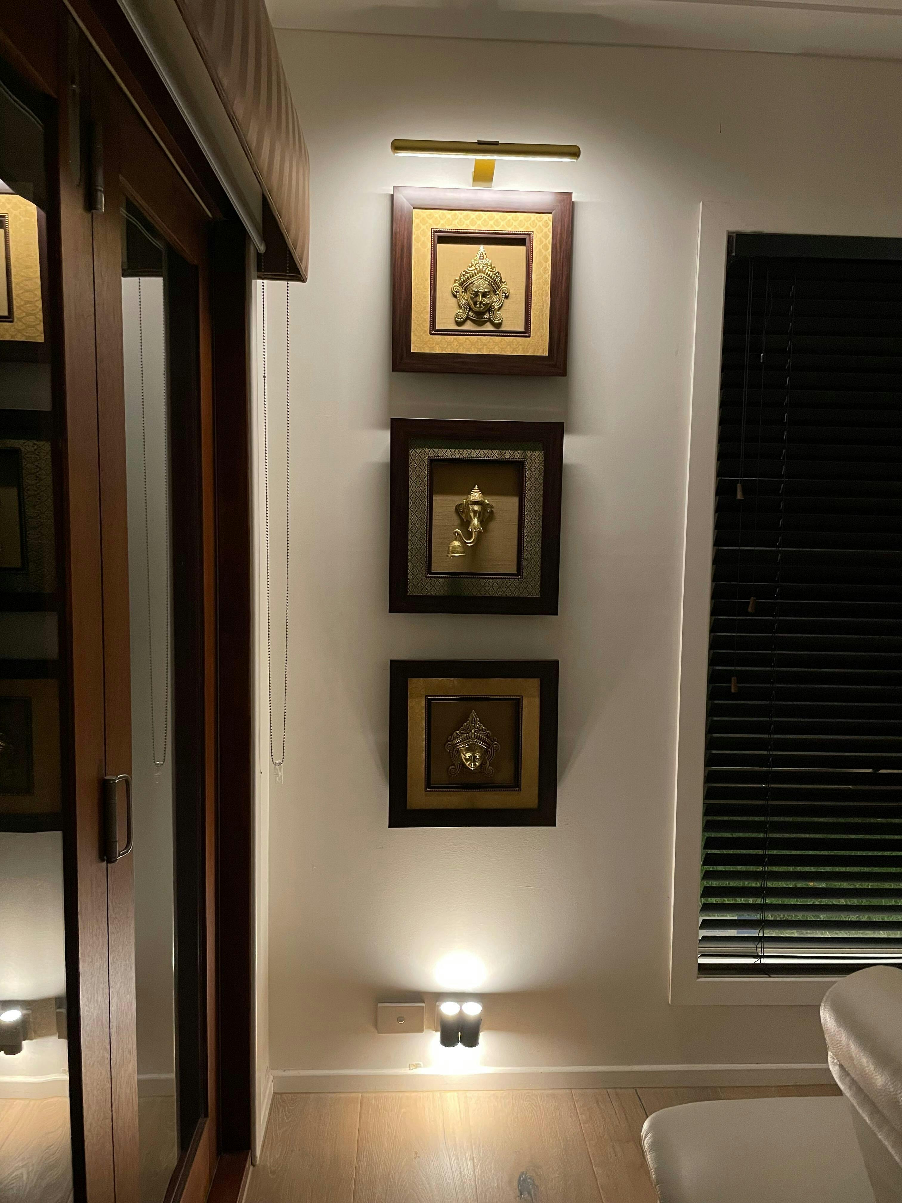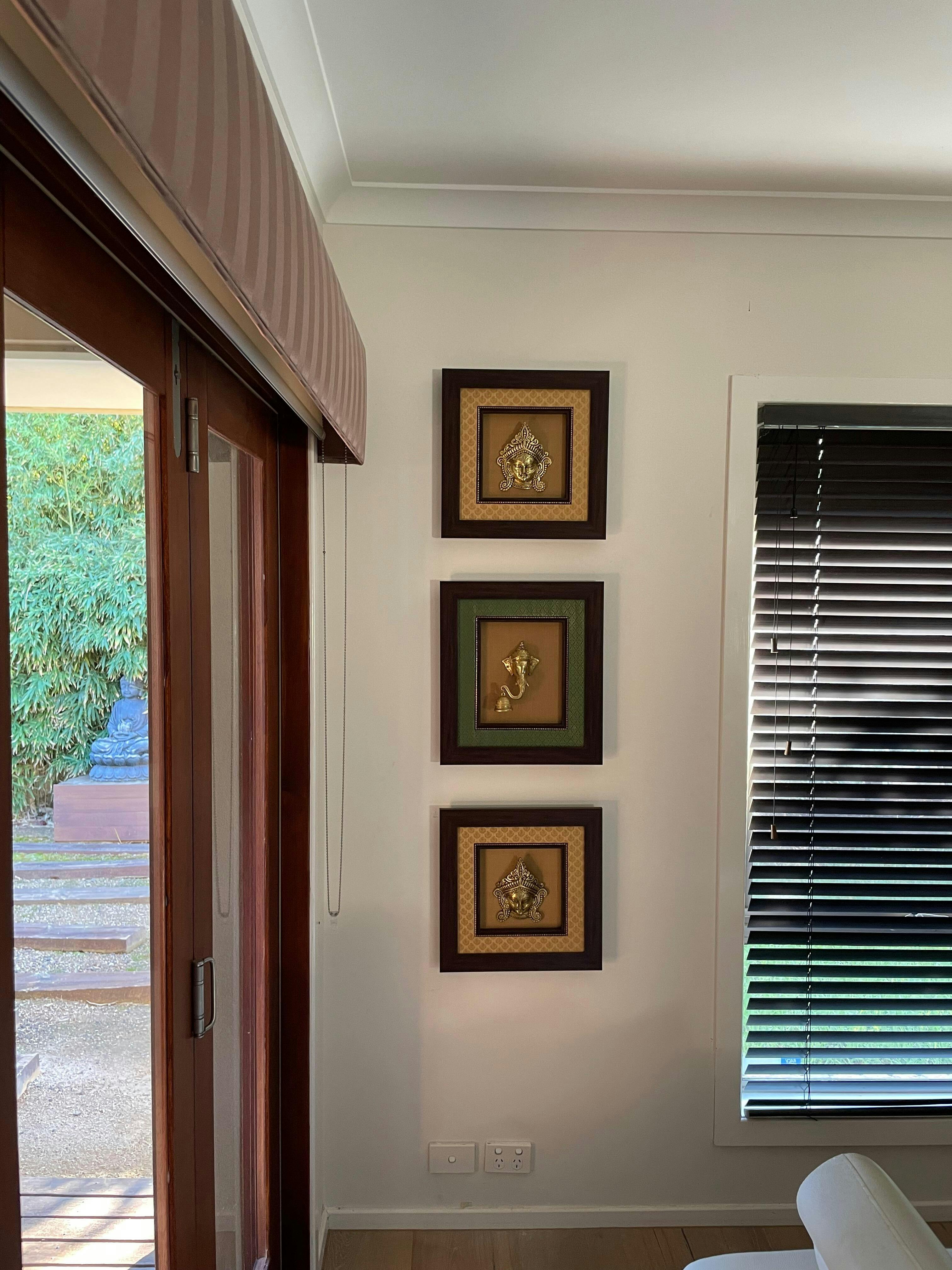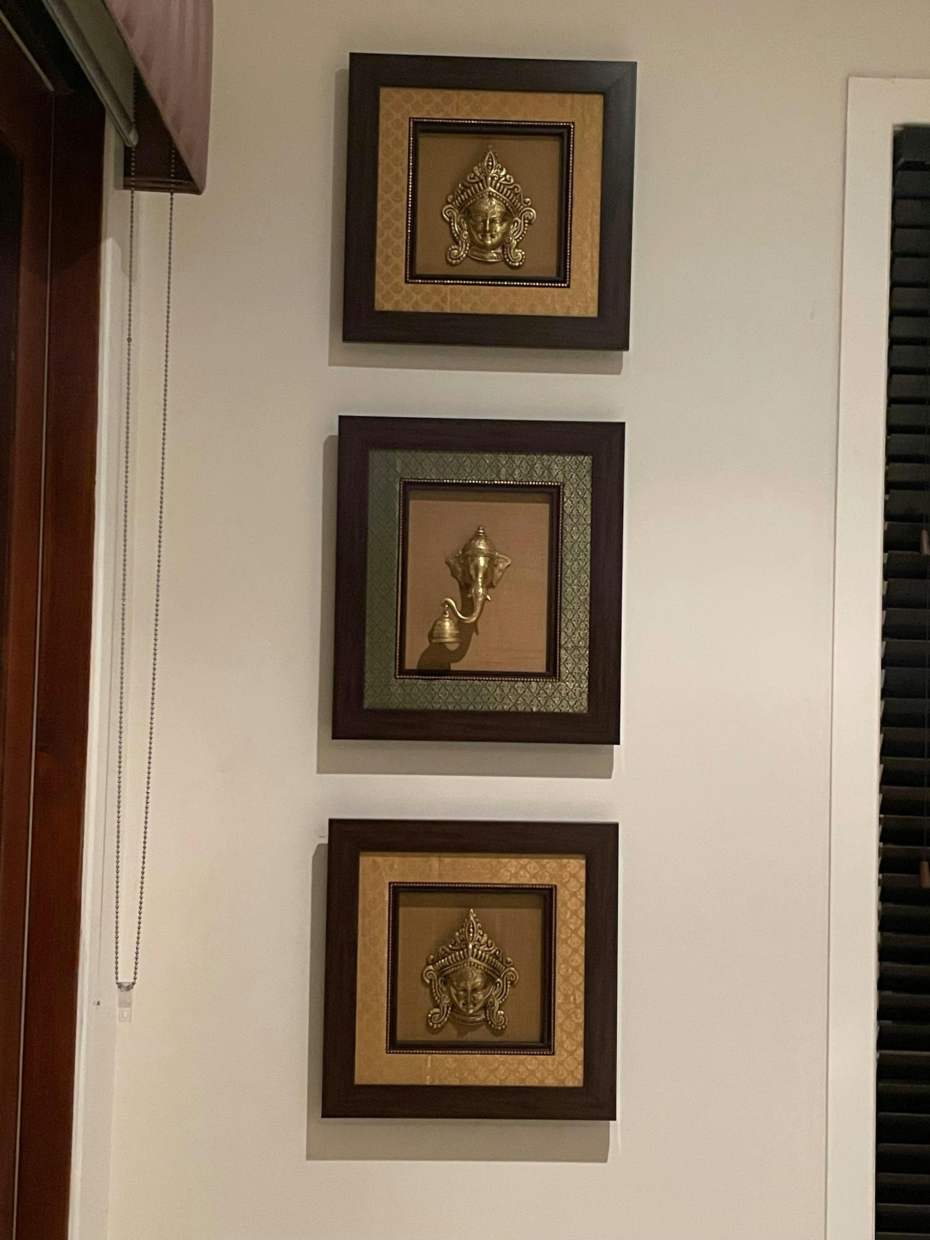 This handcrafted brass idol is mounted on a luxurious raw silk backdrop and encased in a beautifully finished wooden frame — blending spiritual symbolism with timeless elegance. The rich texture and refined detailing make it a striking statement piece for any interior.