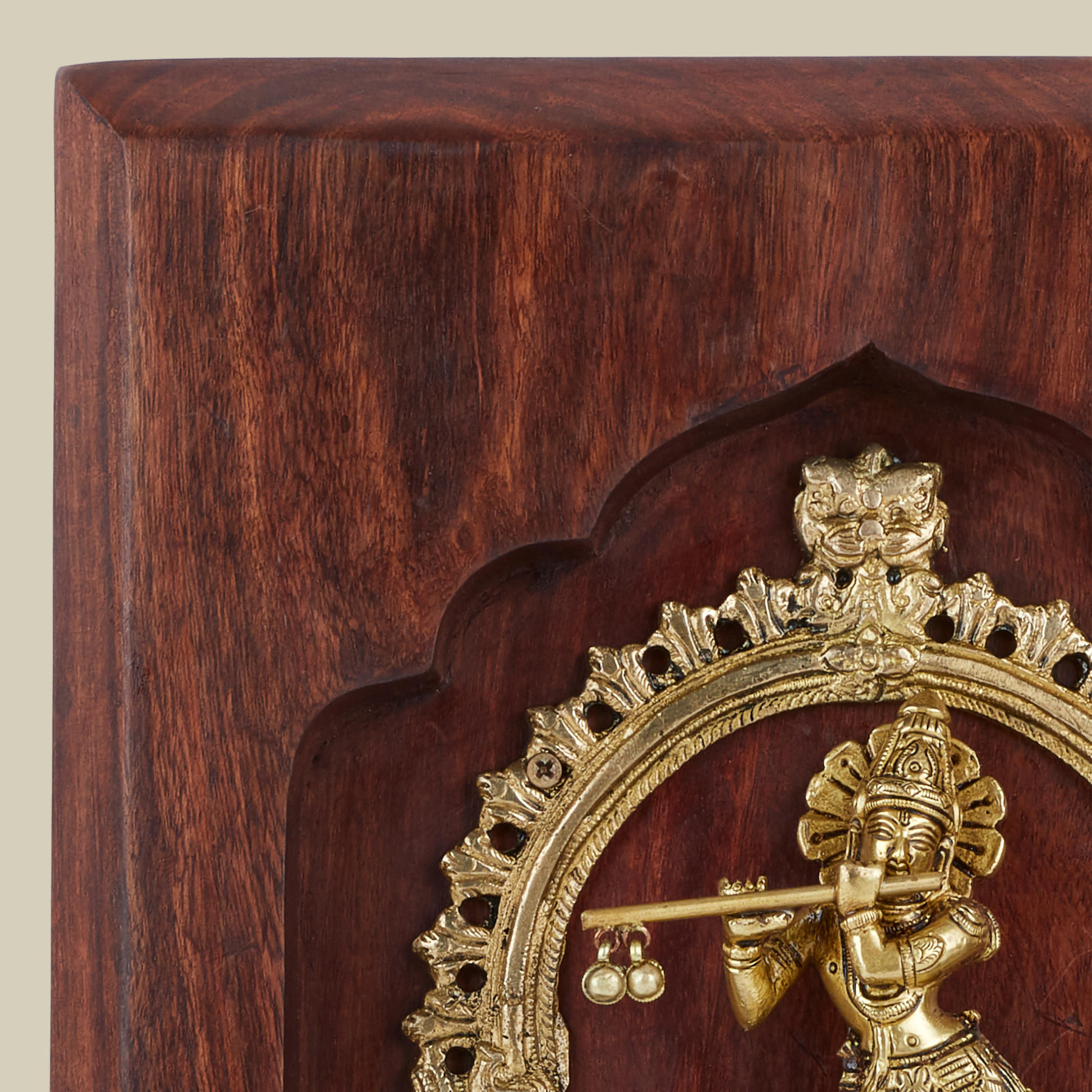 Krishna Brass Idol with Prabhavali – Framed on Sheesham Wood