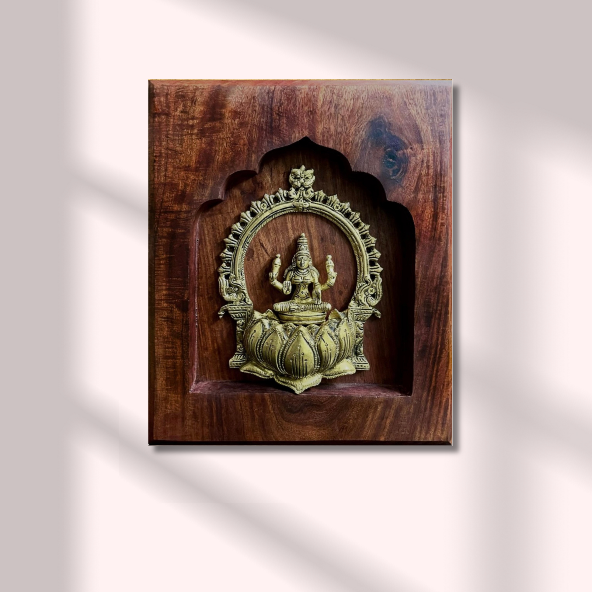 Lakshmi Brass Idol on Lotus with Prabhavali – Framed on Sheesham Wood