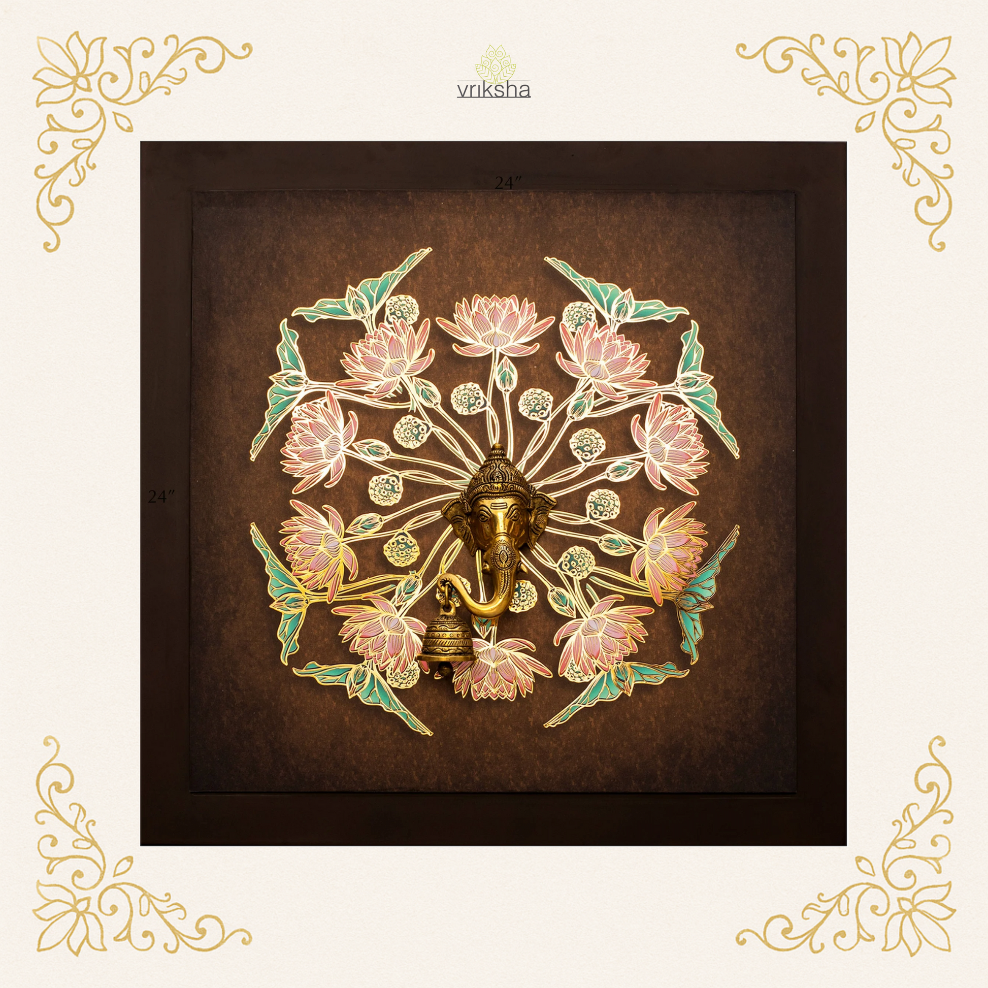 Begin every new journey with the blessings of Lord Ganesha, the remover of obstacles and harbinger of good fortune. This exquisite wall art features a finely crafted brass Ganesha idol, set against a digitally printed backdrop and adorned with intricate 24-carat gold-coated metal detailing.