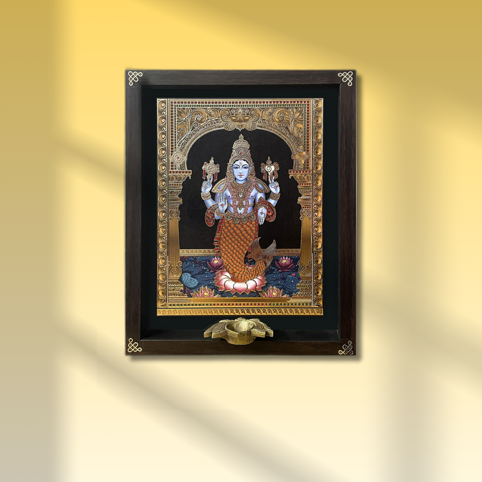 The first of Lord Vishnu’s ten avatars, Matsya appears as a sacred fish to save humanity and the Vedas from a great flood. This vibrant digital art, embellished with 24K gold-coated metal, captures the graceful divinity of Matsya atop a blooming lotus, framed in teakwood-finish synthetic wood—a symbol of cosmic rescue and eternal wisdom.