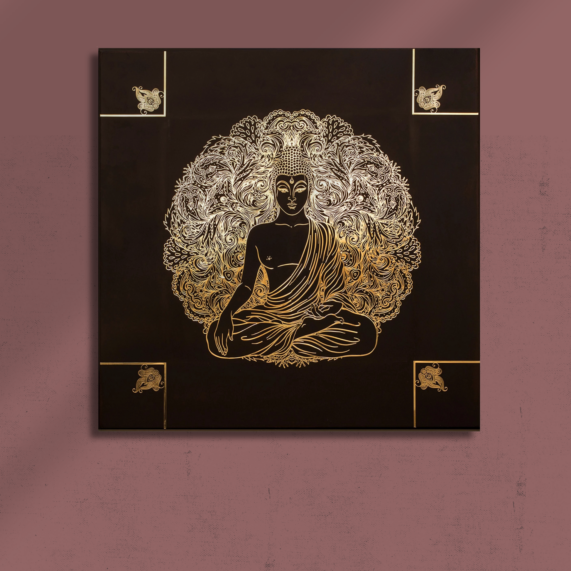 Dhyana Mudra The back of its right hand is leaning on the palm of its left hand. Often the thumbs are touching each other, forming the mystic triangle. This is the meditation mudra, which symbolises wisdom. The Buddha used this gesture during his final meditation under the Bodhi tree when he attained enlightenment. This unique 24 carat gold coated metal art on wood, would fit right into any interior as a beautiful piece of home decor. The subtle use of wafer thin gold in a fine and intricate manner gives it a rich and sophisticated quality. Makes a great gifting article for friends, relatives and colleagues.