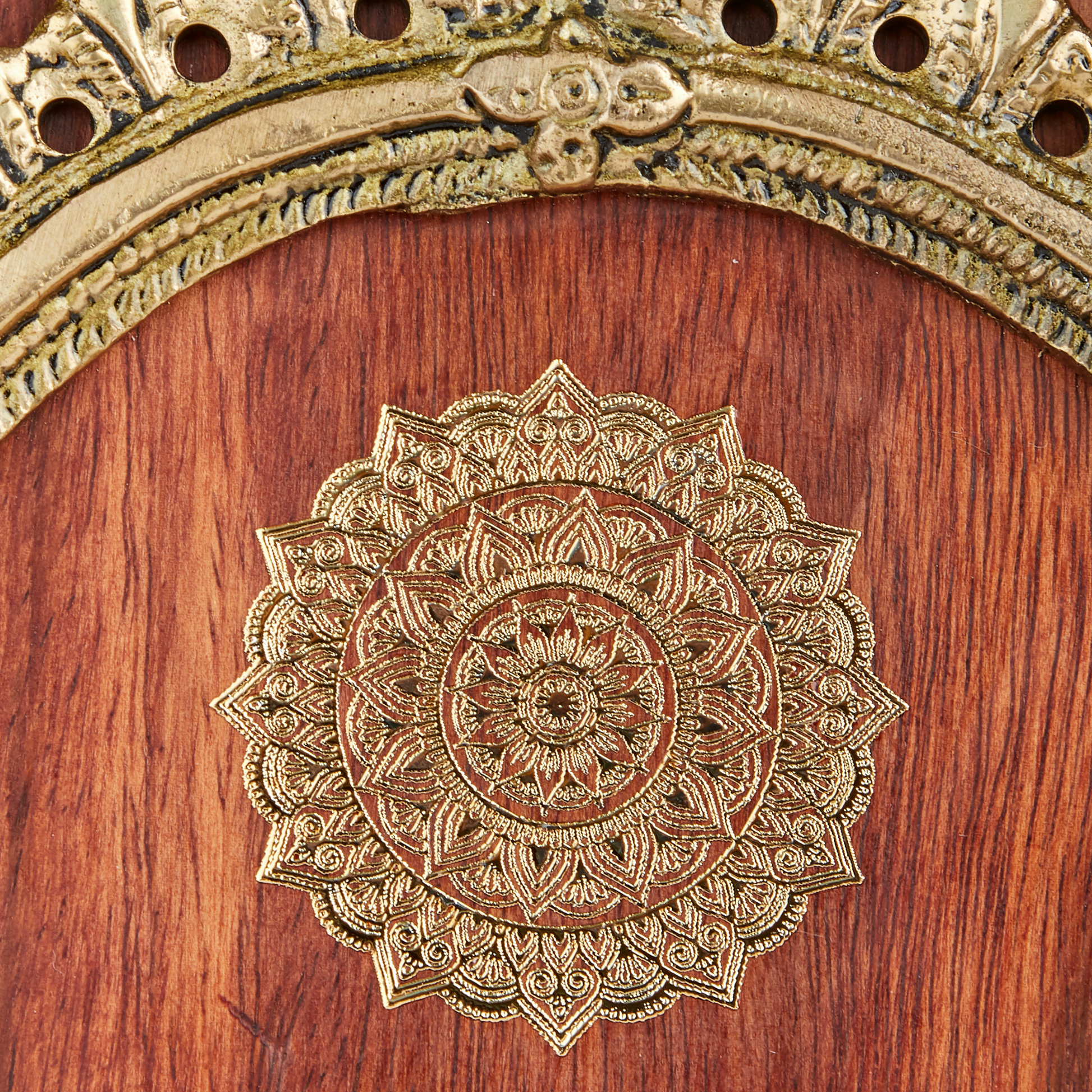 Celebrate timeless devotion and artisan craftsmanship with this exquisitely framed brass idol, backed by a finely detailed Prabhavali (sacred arch) and mounted on solid Sheesham wood with a rich walnut finish. The graceful composition brings together spiritual symbolism and natural beauty, making it a thoughtful addition to any home temple or sacred space.