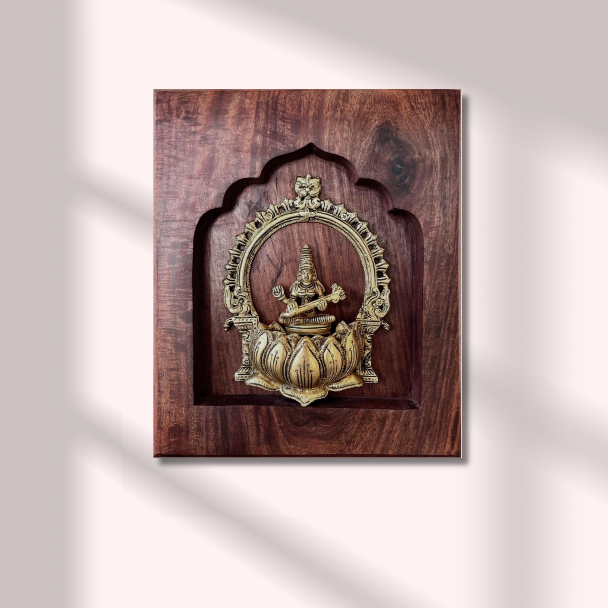 Saraswati Brass Idol on Lotus with Prabhavali – Framed on Sheesham Wood