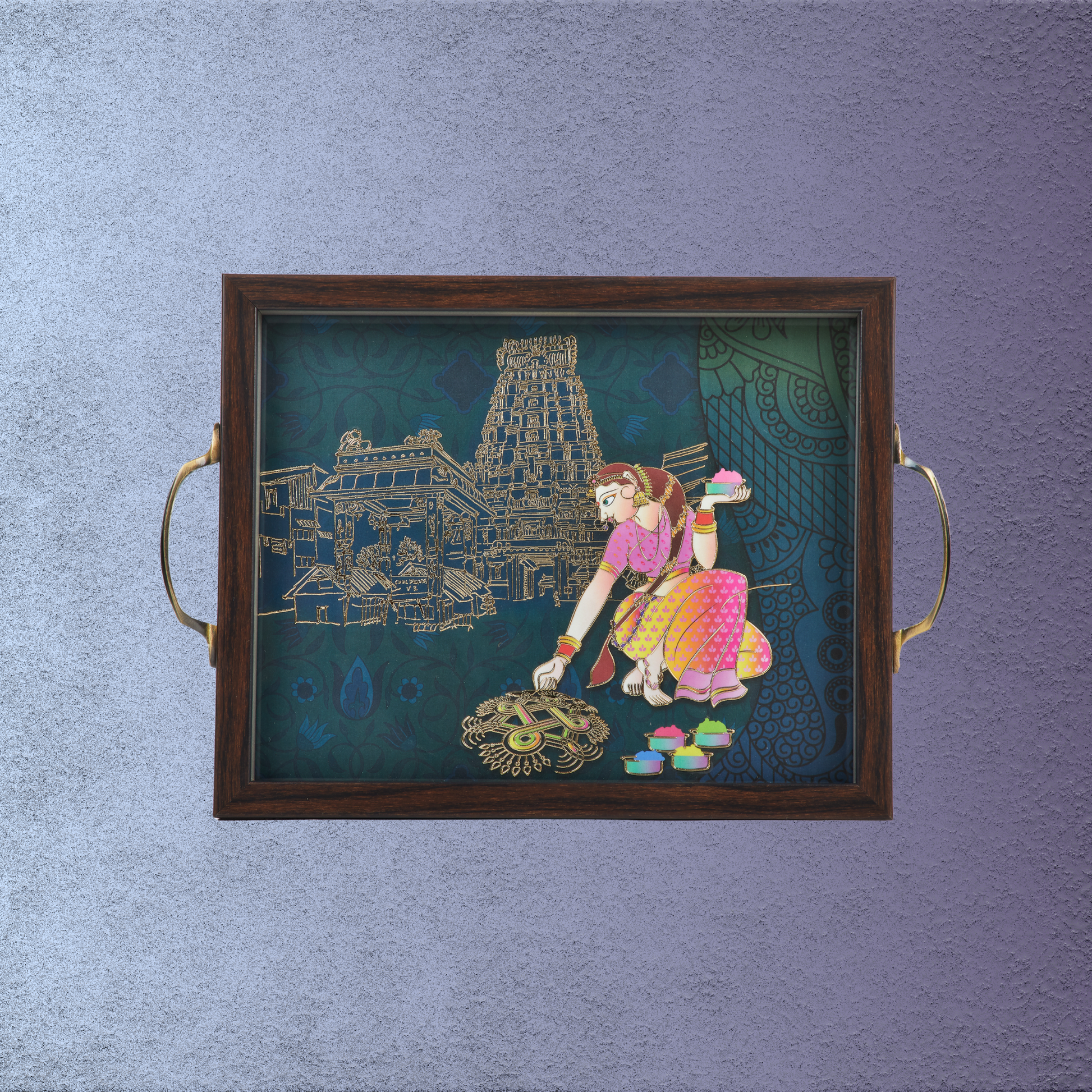 Step into a sacred South Indian morning with this handcrafted serving tray featuring a graceful woman creating a vibrant kolam, set against the iconic backdrop of a temple town.